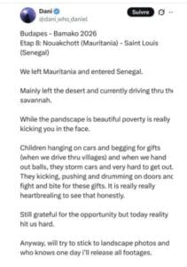أثارت تدوينة لرحّالة أجنبي وثّق عبوره من موريتانيا إلى السنغال ضمن سباق “بودابست – باماكو” موجة تفاعل واسعة على منصات التواصل الاجتماعي، بعدما وصف مشاهد صادمة لأطفال يتشبثون بالسيارات ويتدافعون بعنف من أجل الحصول على هدايا بسيطة.
