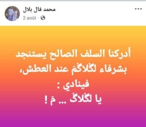 التدوينة، التي نشرها ولد بلال على وسائل التواصل الاجتماعي، تضمنت استنجادًا بقبيلة “لكلاگمة” بدلًا من قبيلة “الغظف”، وهو ما فسّره خصومه بأنه تلميح ذو دلالة قبلية حساسة.في وقت حساس !