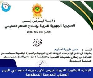 قدّمت الإدارة الجهوية للتربية وإصلاح التعليم بولاية تيرس زمور تهنئة رسمية للسيد : محمد المختار حسني عبداوة ، الملقب أيوب المدير العام لخيرية الشركة الوطنية للصناعة والمناجم “اسنيم”، بمناسبة الاحتفال بـ اليوم الوطني للمدرسة الجمهورية الذي يمثل مناسبة وطنية لترسيخ قيم التعليم والإنصاف وتعزيز دور المدرسة في بناء اللحمة الاجتماعية.