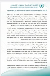 بيان من اللجنة الوطنية لحقوق الإنسان، يتعلق بقضية السيدة المتوفاة فاطمة حمادي باه