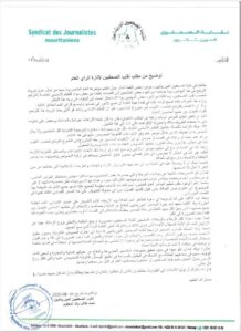 تاسعا: نؤكد التمسك الصارم بالمبادئ الراسخة لنقابة الصحفيين الموريتانيين الداعية إلى احترام النصوص القانونية، وصون حقوق الأعضاء جميعا، ورفض الاحتكار ونبذ الإقصاء، والاحتكام إلى ميزان العدالة والقانون، كلما دعت الضرورة إلى ذلك وعدم القبول باستغلال النقابة للأجندة الشخصية واستخدام شعارها في توجهات لا تتماشى مع المصالح العامة لمنتسبيها أو استغلاله في قضايا خاصة أو توظيفه في سياقات لا تمت لرسالتها النبيلة بصلة.